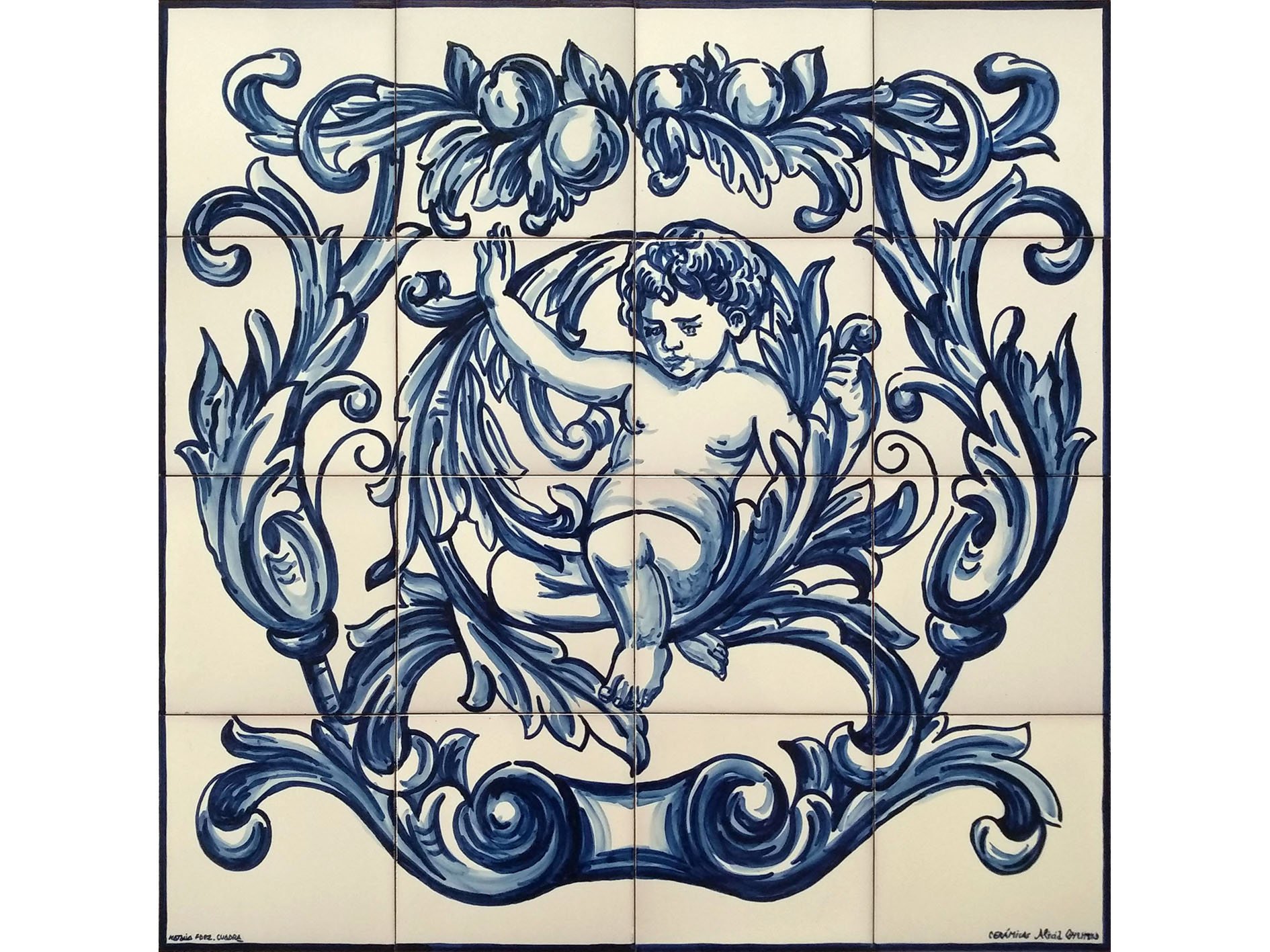 Baldosas pintadas a mano con la técnica óxidos colorantes sobre cubierta, apto para exterior. Mural compuesto por dieciseis azulejos con dibujo decorativo de ángeles de estilo clásico en tonos azules. Tamaño 60x60cm. Nuestros murales de cerámica están hechos de manera totalmente artesanal, no realizamos impresión cerámica. La cocción de nuestras baldosas es siempre a 980ºC, asegurando así su calidad, durabilidad y resistencia. Por ello son ideales para decorar tanto en interior como en exterior.