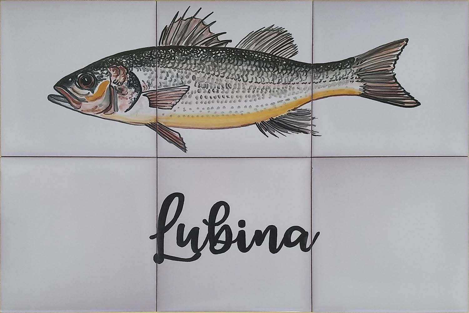 Mural de cerámica de la colección peces: Lubina. Puede comprar los murales independientes o realizar una de las composiciones que le proponemos: como cenefa en horizontal, o en columna para un espacio vertical.